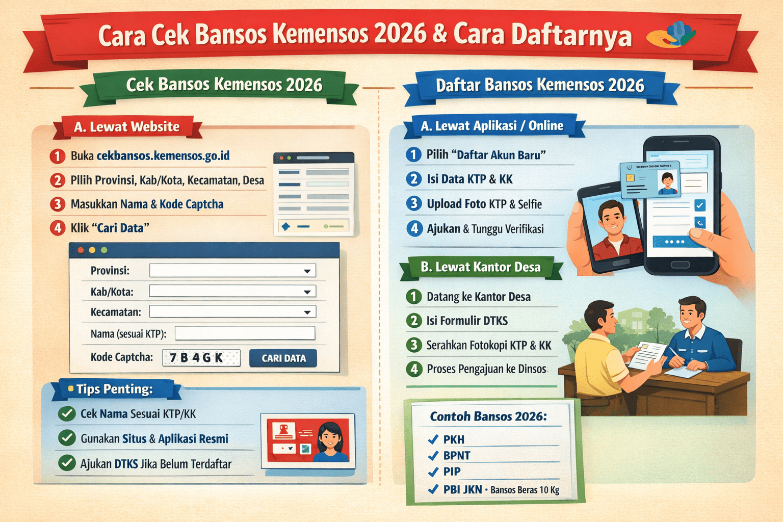 Oleh karena itu, artikel ini akan membahas panduan lengkap cara pengecekan serta pendaftaran bansos Kemensos 2026, mulai dari cara pengecekan, syarat penerima, sampai cara pendaftaran. Dengan mengikuti langkah-langkah di bawah ini, kamu bisa memastikan tidak ketinggalan informasi penting seputar bantuan sosial tahun 2026.