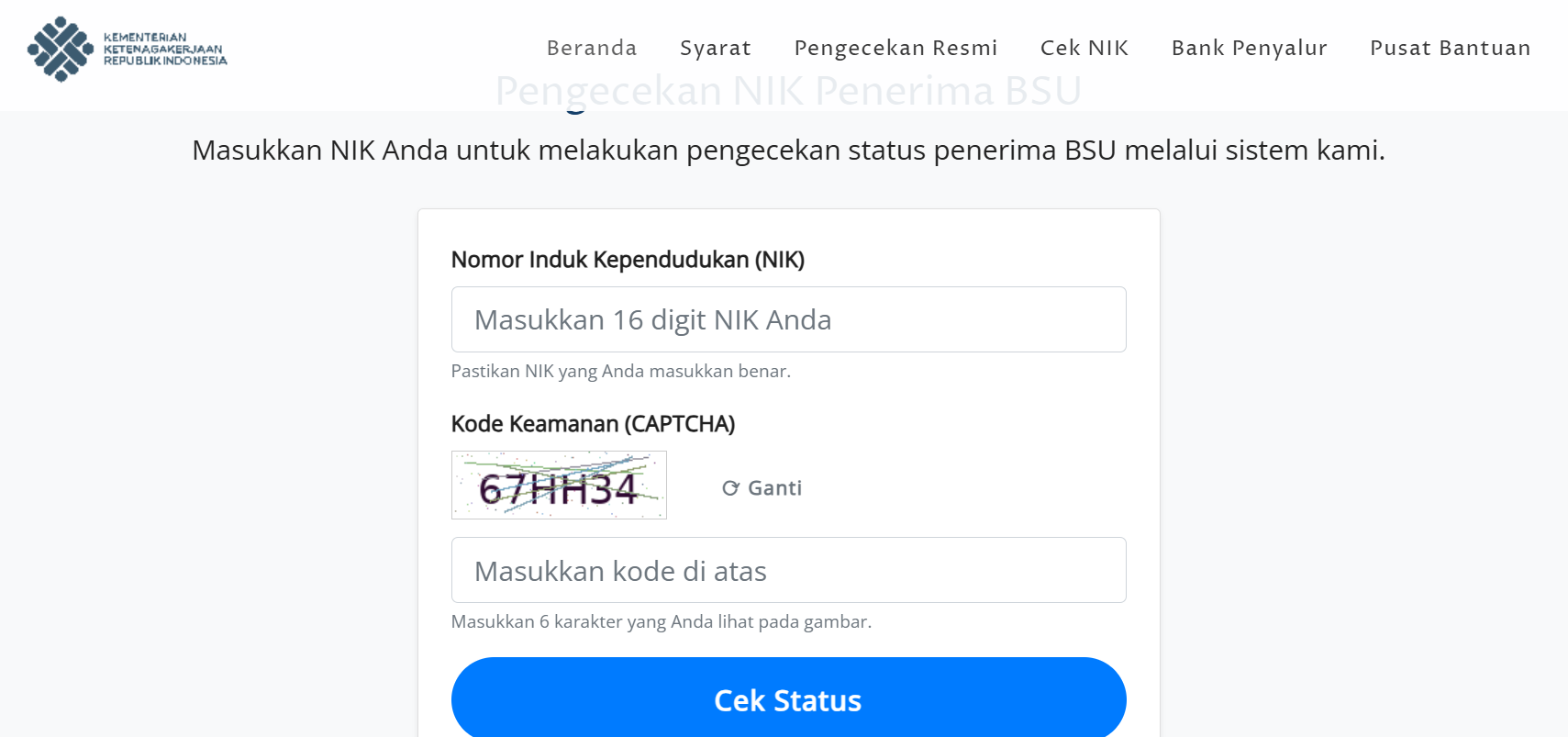 - Buka situs resmi Kemnaker https://bsu.kemnaker.go.id/#pengecekanMandiri.