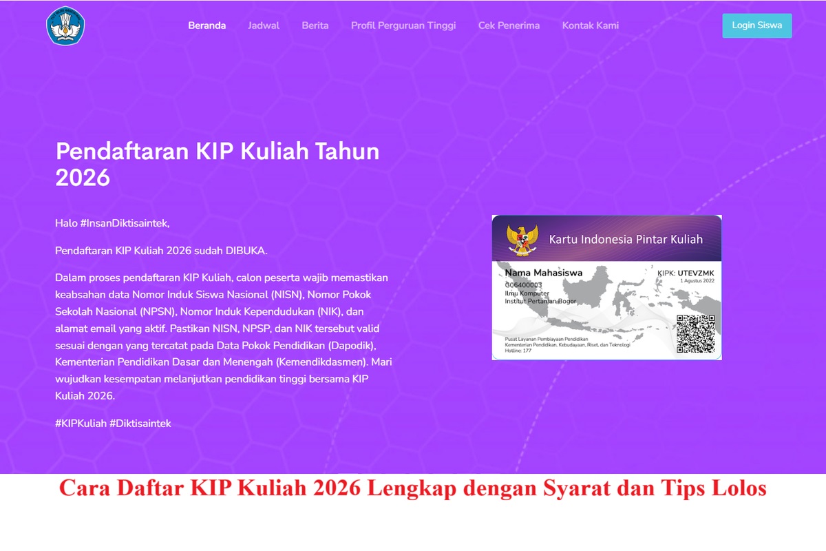 Pendaftaran KIP Kuliah 2026 resmi dibuka! Program beasiswa ini menjadi peluang besar bagi lulusan SMA/SMK/sederajat yang ingin kuliah gratis tanpa terbebani biaya.