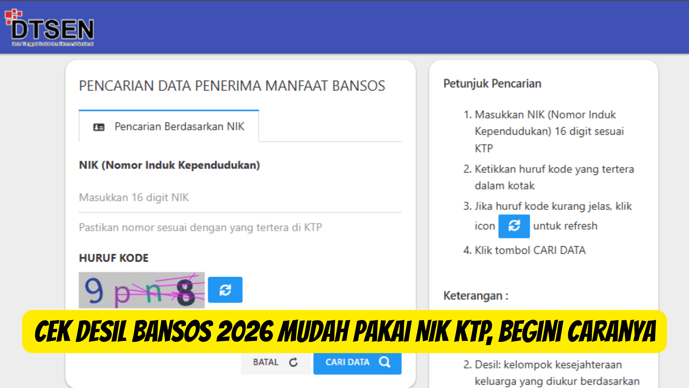 Dilansir dari laman Kompas.tv, cara cek desil bansos pakai NIK KTP dapat dilakukan lewat laman resmi cek bansos Kemensos di cekbansos.kemensos.go.id. adapun langlah-langkah cara ceknya yaitu sebagai berikut: