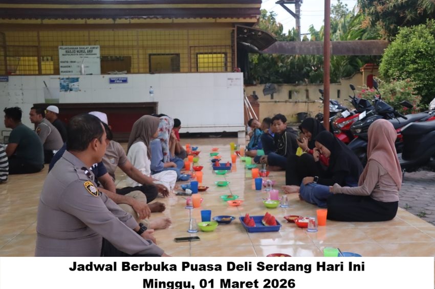 Diinformasikan kepada Umat Islam di Deli Serdang dan sekitarnya bahwa waktu berbuka puasa pada Minggu, 1 Maret 2026, adalah pukul 18.41 WIB. Saat azan Maghrib berkumandang pada waktu tersebut, puasa Ramadhan 1447 Hijriah hari itu pun berakhir, dan umat Muslim diperbolehkan untuk segera berbuka setelah seharian menahan lapar dan dahaga sejak Subuh.