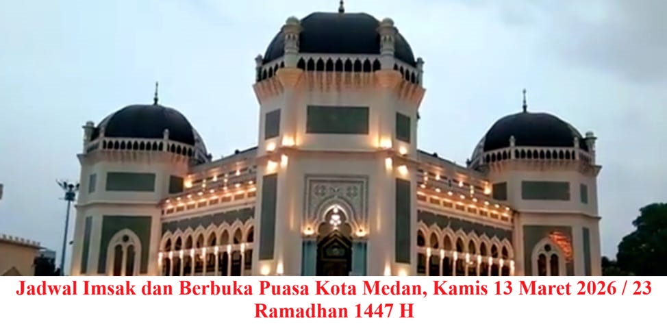 Pada hari Kamis, 13 Maret 2026, umat Muslim di Kota Medan menjalankan ibadah puasa pada hari ke-23 di bulan suci Ramadhan 1447 Hijriah. Waktu berbuka puasa ditandai dengan adzan Maghrib, yang menandai berakhirnya puasa setelah menahan lapar dan dahaga sejak terbit fajar hingga Maghrib.