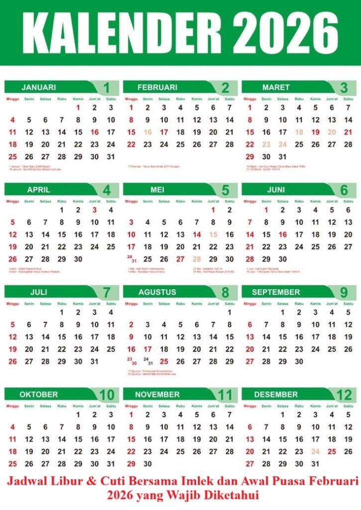 Di bulan Februari 2026 menjadi momen yang dinantikan oleh masyarakat Indonesia karena menghadirkan libur nasional, cuti bersama Imlek 2026, serta libur awal Ramadhan 2026. Kesempatan ini bisa dimanfaatkan untuk istirahat, liburan singkat, atau mudik bersama keluarga.