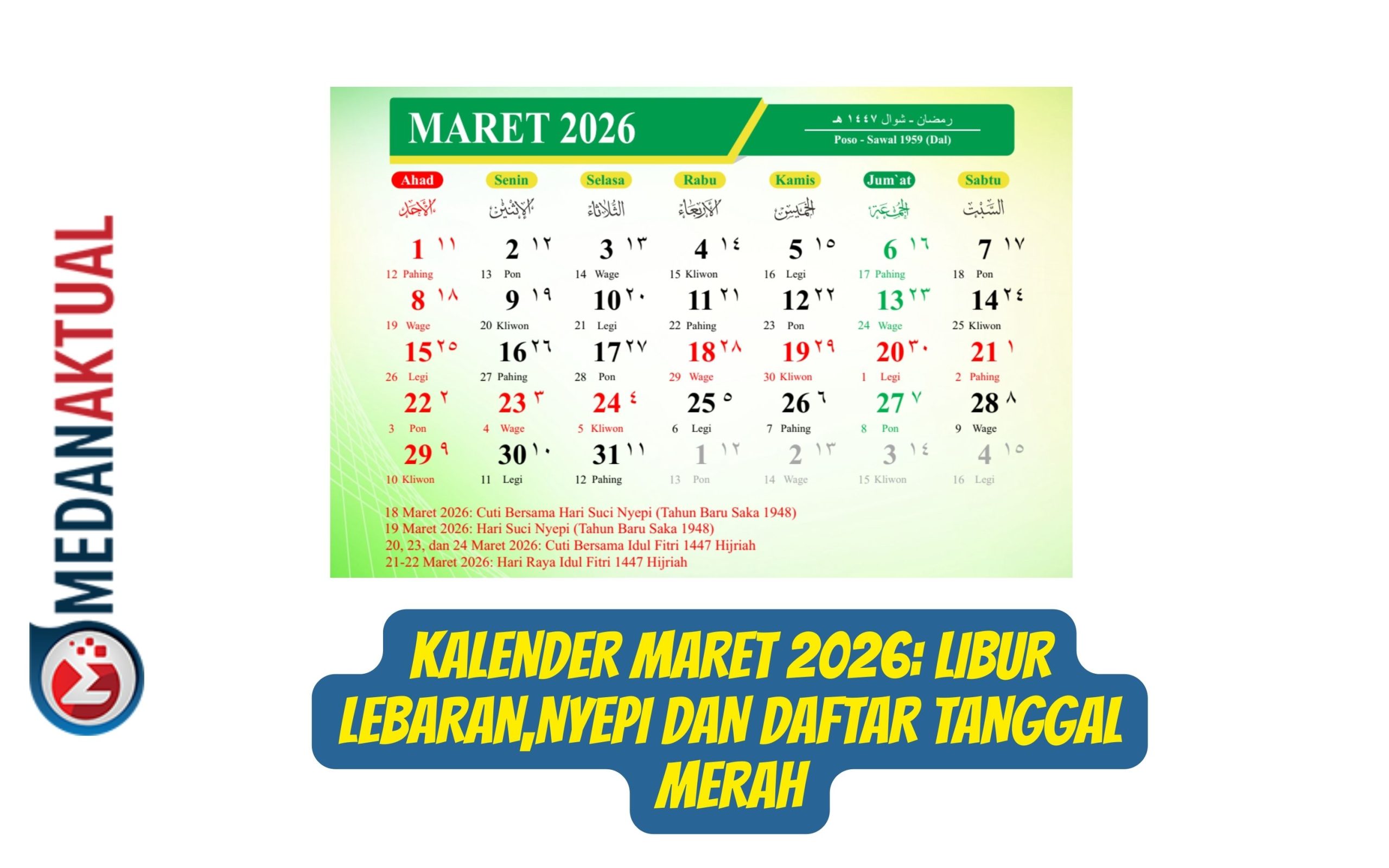- 21 Maret 2026 (Sabtu) – Idul Fitri 1447 H (Hari 1) (Libur Nasional)