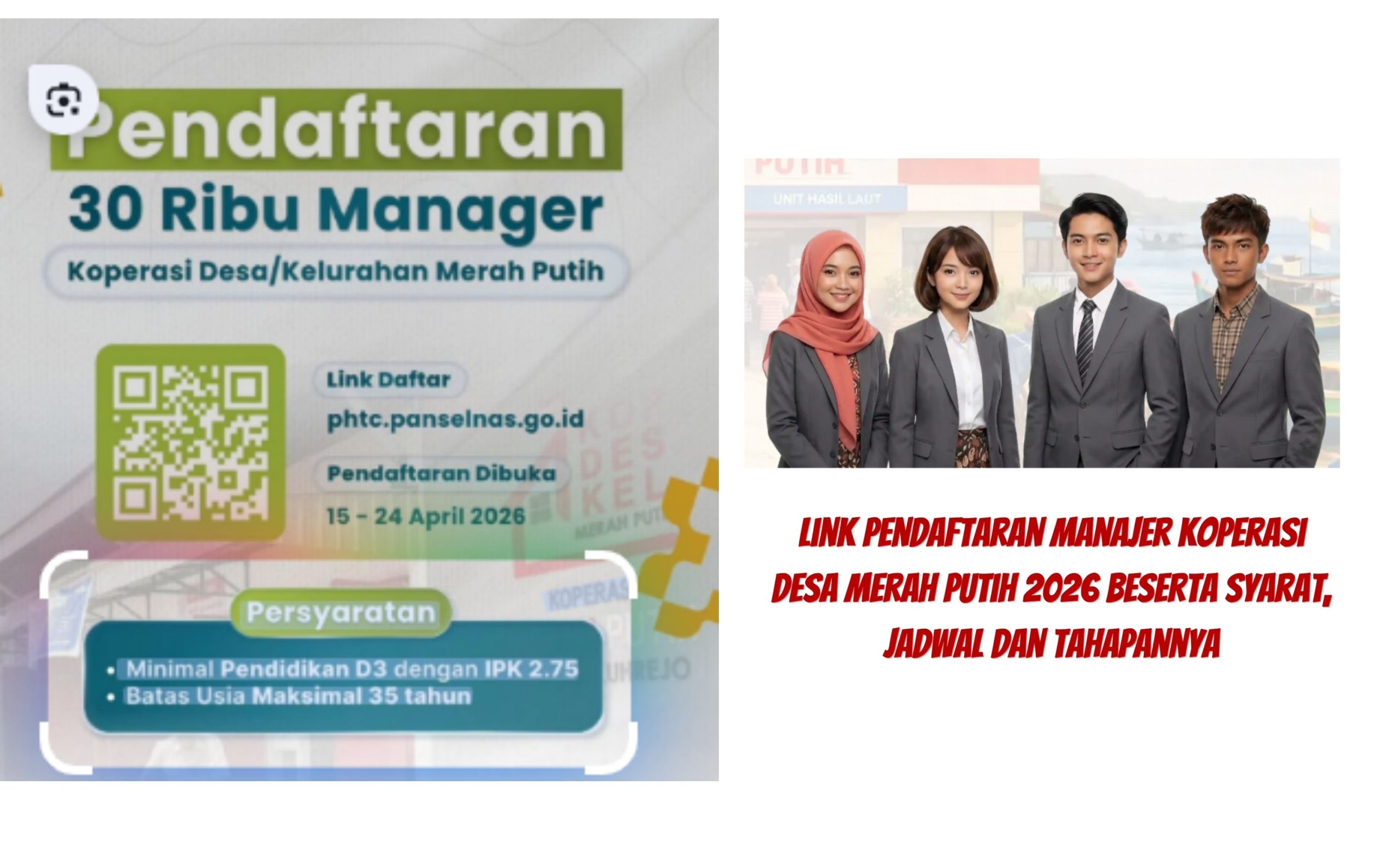 Link pendaftaran Manajer Koperasi Desa Merah Putih 2026 dibuka oleh Pemerintah melalui Panitia Seleksi Nasional SDM Program Hasil Terbaik Cepat (PHTC). Pendaftaran ini untuk mencari 35.476 formasi, termasuk 30.000 Manajer Koperasi. Pendaftaran online di https://phtc. panselnas. go.id/ dari 15 hingga 24 April 2026, dengan syarat D3, IPK 2.75, usia maksimal 35 tahun.