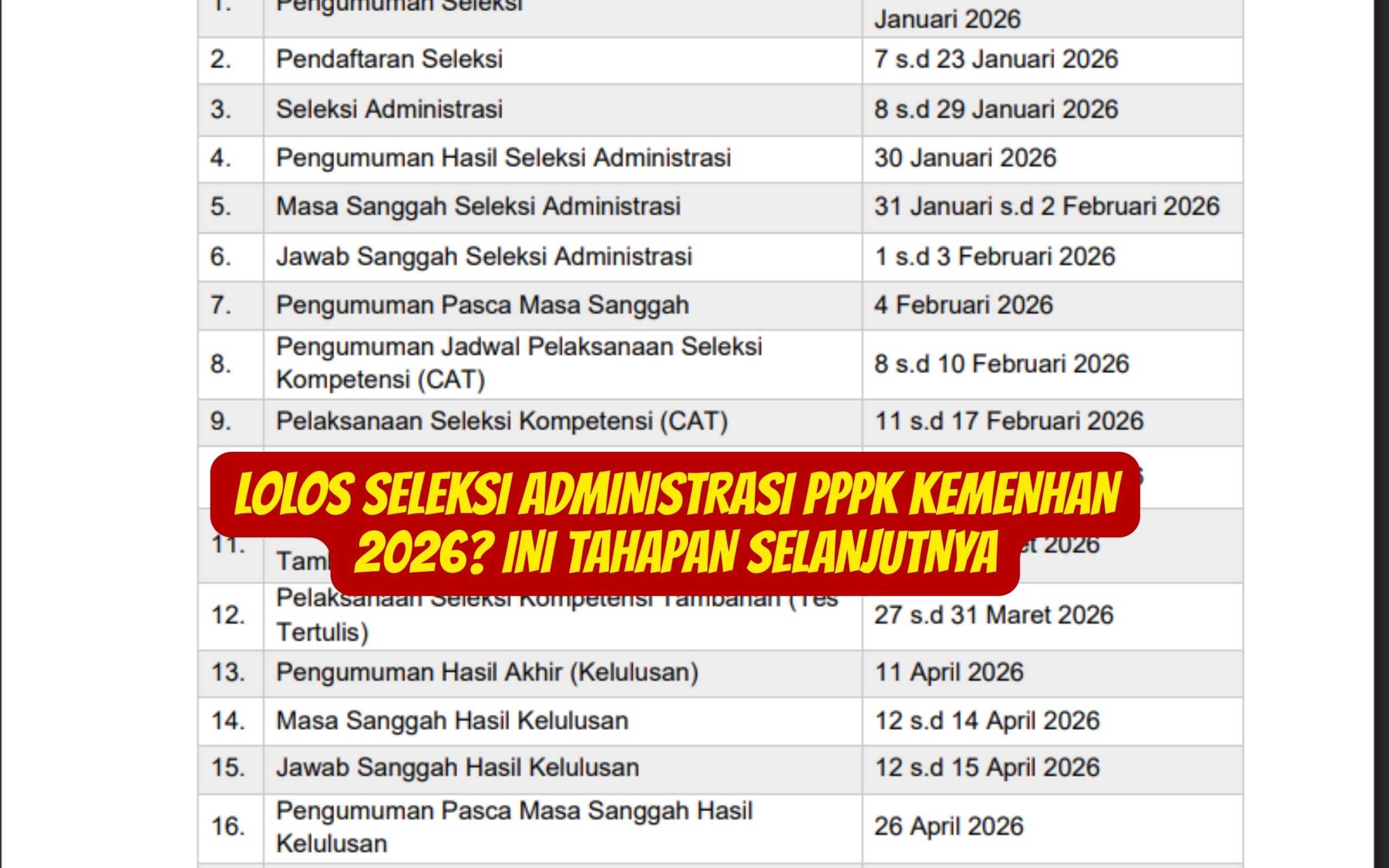 Bagi peserta yang lolos seleksi administrasi PPPK Kemenhan 2026, maka mereka berhak mengikuti seleksi selanjutnya. Sesuai jadwal seleksi, pada tanggal 30 Januari 2026 diumumkan hasil seleksi administrasi PPPK Kemenhan 2026 lewat website dan akun sscasn.bkn.go.id.