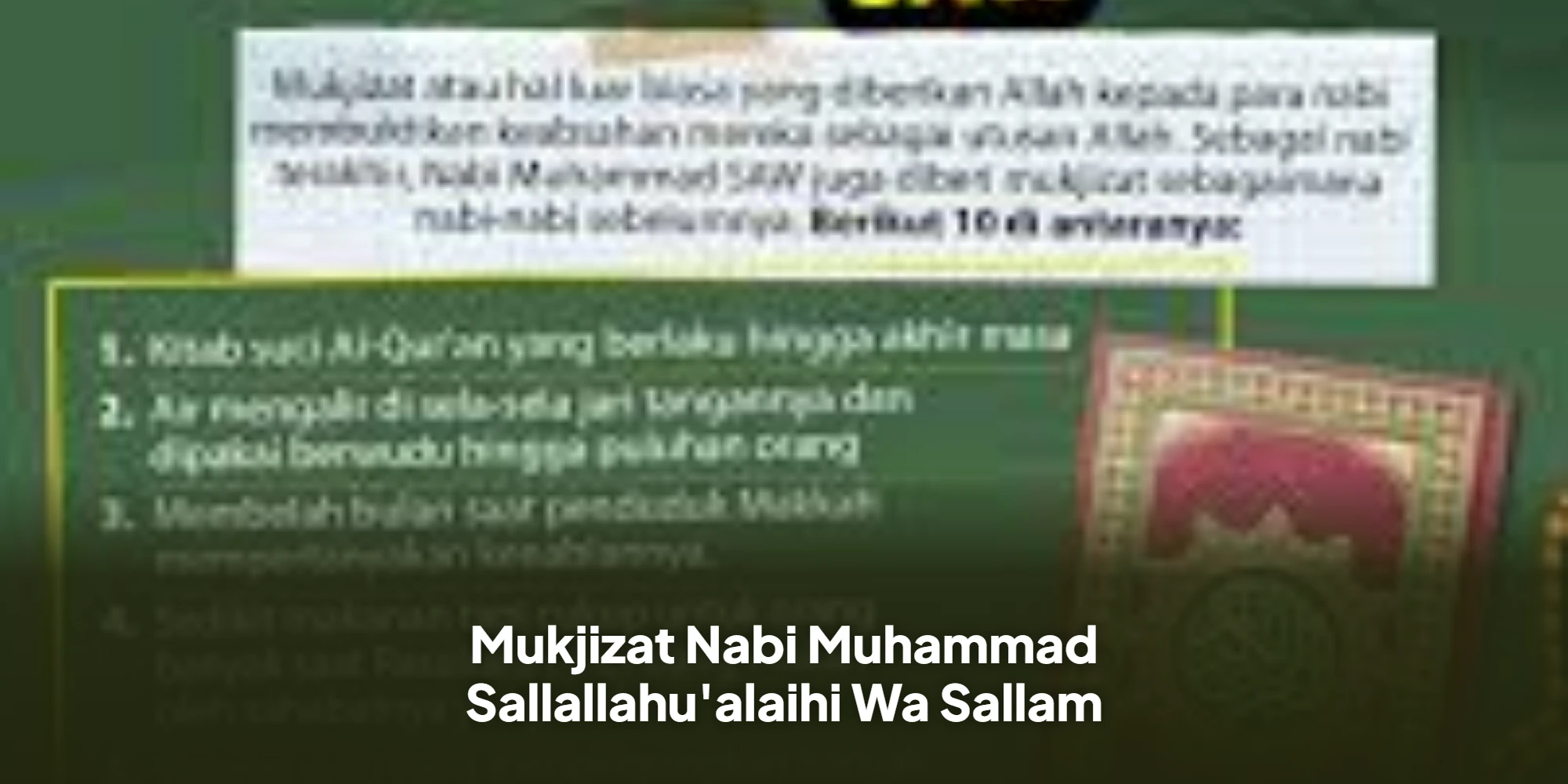 Mukjizat adalah suatu hal di luar kebiasaan manusia yang diberikan Allah SWT kepada para Nabi. Salah satu mukjizat yang dimiliki Nabi Muhammad SAW adalah Al-Quran yang dijadikan sebagai kitab suci umat Islam.