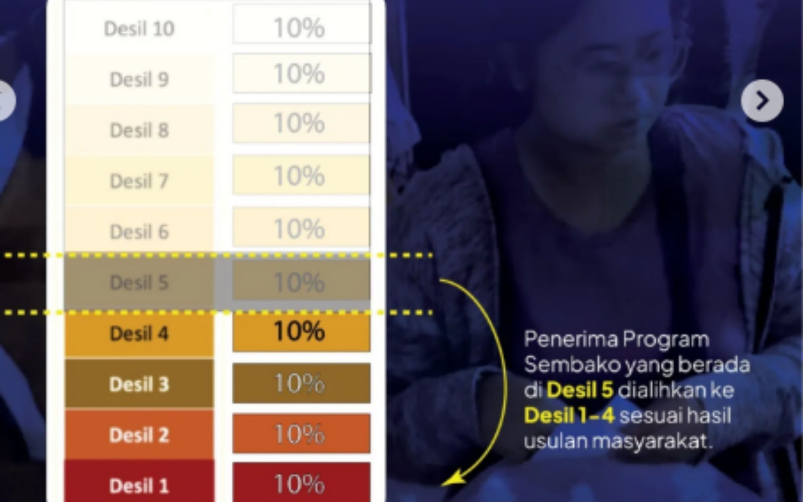 Hal ini berarti keluarga yang berada di Desil 5 akan dialihkan dan tidak lagi menerima bantuan, sementara keluarga di Desil 1 hingga 4 yang lebih membutuhkan akan menerima BPNT.