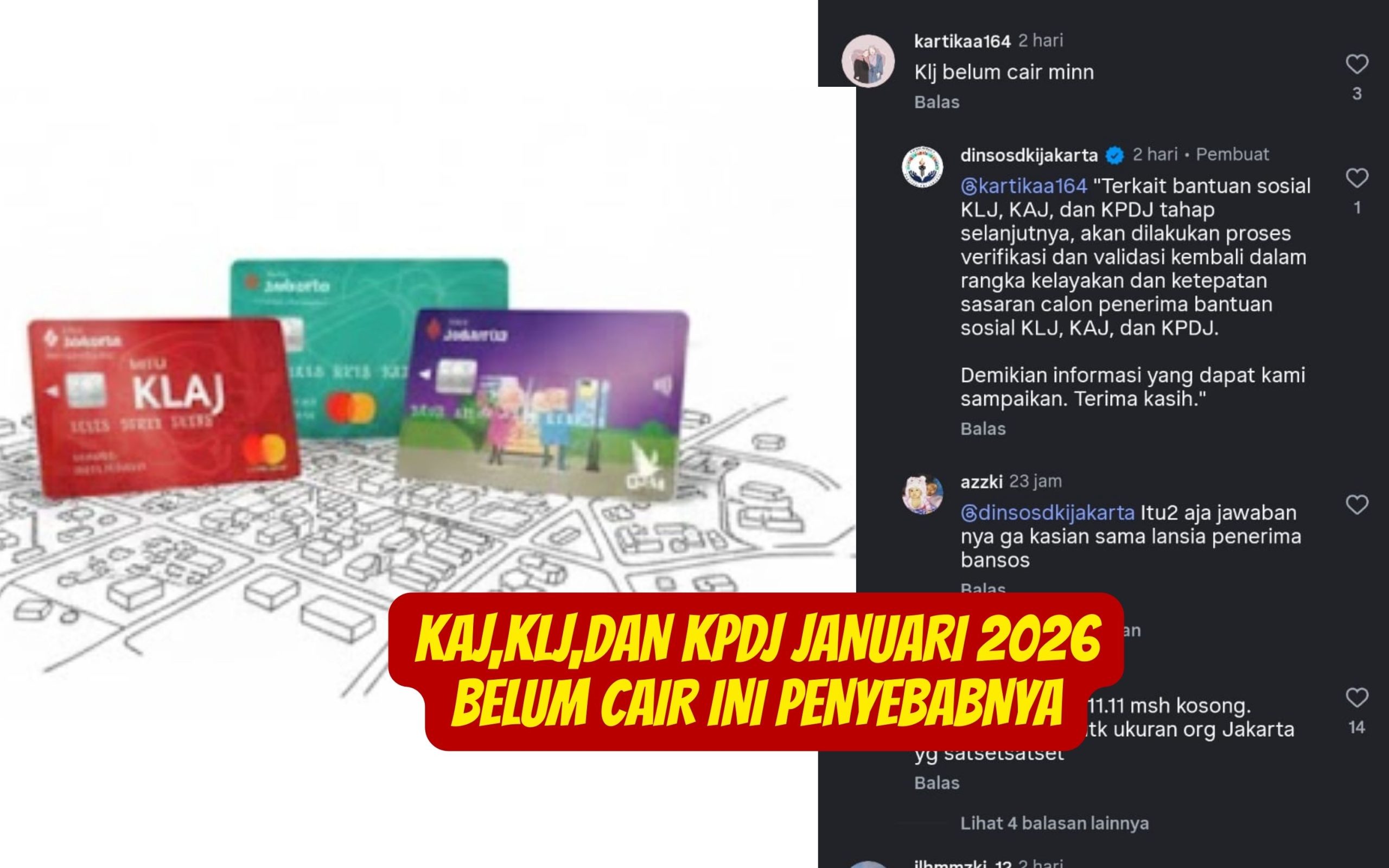 Dilansir dari komentar postingan Instagram dinsosjakarta, terkait bantuan sosial KAJ,KLJ,dan KPDJ Januari 2026 belum cair disebabkan adanya proses verifikasi dan validasi ulang. Langkah ini diambil untuk memastikan kelayakan serta ketepatan sasaran bagi para calon penerima bantuan tersebut.